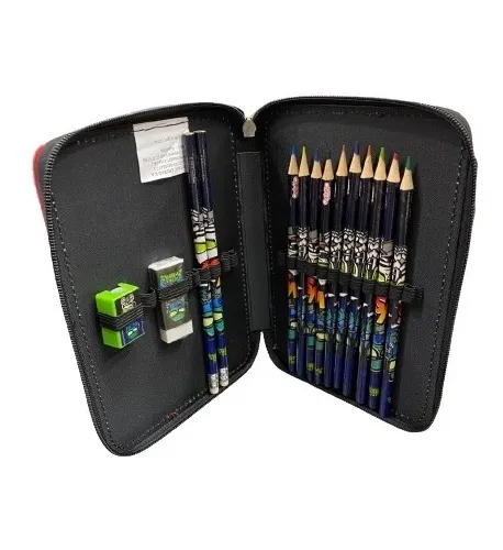 Contiene 10 lapices de colores, 1 goma, 1 sacapuntas y 2 lapices negros
